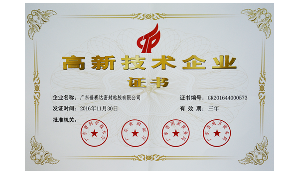 近日,公布了《2016年國家高新技術(shù)企業(yè)復審結(jié)果》,廣東普賽達密封粘膠有限公司榜上有名,標志著公司順利通過高新復審,再次被認定為高新技術(shù)企業(yè),現(xiàn)已頒發(fā)證書。(證書編號:GR201644000573)