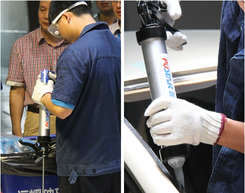 公司技術(shù)工程師就“汽車玻璃粘膠使用及注意事項(xiàng)”課程作了專業(yè)的講解,并引導(dǎo)學(xué)員進(jìn)行了現(xiàn)場的實(shí)際操作。