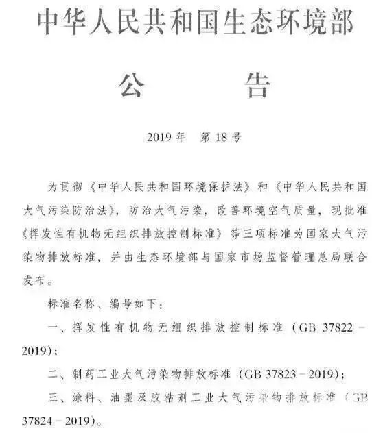 同時發(fā)布的還有《揮發(fā)性有機(jī)物無組織排放控制標(biāo)準(zhǔn)》(GB 37822-2019)、《制藥工業(yè)大氣污染物排放標(biāo)準(zhǔn)》(GB 37823-2019)等兩項強(qiáng)制性國家標(biāo)準(zhǔn)。