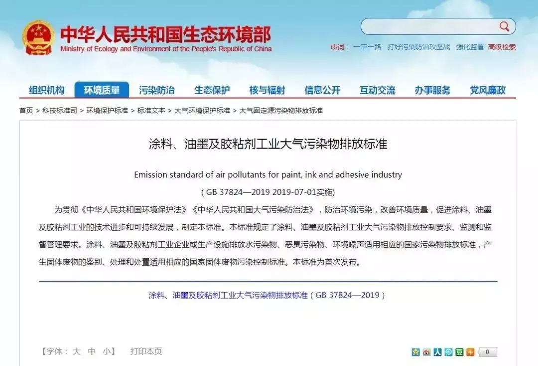 為貫徹《中華人民共和國環(huán)境保護(hù)法》和《中華人民共和國大氣污染防治法》,防治大氣污染,改善環(huán)境空氣質(zhì)量,2019年5月24日生態(tài)環(huán)境部聯(lián)合國家市場監(jiān)督管理總局發(fā)布了強(qiáng)制性國家標(biāo)準(zhǔn)《涂料、油墨及膠粘劑工業(yè)大氣污染物排放標(biāo)準(zhǔn)》(GB 37824-2019)。