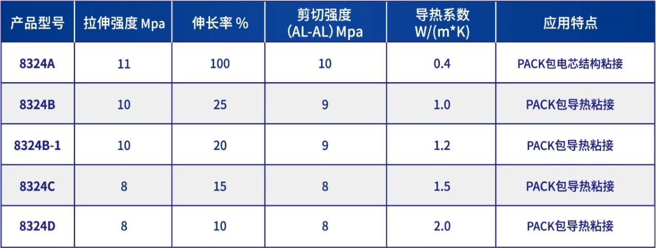 應(yīng)用于新能源電池模組導(dǎo)熱粘接、電芯與電芯之間的粘接及其他有導(dǎo)熱要求的材料自粘或互粘。