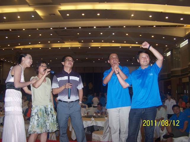 第三部分,慶典晚宴。8月12日晚6點慶典晚宴在天天漁村進行,總經(jīng)理及嘉賓代表共同開啟生日香檳、切開生日蛋糕。我們普賽達人與到場約七十位嘉賓舉杯同慶普賽達8周歲生日。晚宴的高潮部分莫過于由普賽達人自編自導(dǎo)的文娛節(jié)目。盡管文娛表演沒有華麗的舞臺布置及燈光效果,但絲毫沒有影響我們整場晚會節(jié)目的表現(xiàn)力。節(jié)目首先以公司全員大合唱《不要認(rèn)為自己沒有用》拉開序幕,大合唱激情的表演力感動了在場的全體嘉賓;第二個節(jié)目是資材部極具新意與看點的《產(chǎn)品時裝秀》表演,自制的道具、恰到好處的臺詞解說及舞臺動作設(shè)計、夸張的表演獲得了臺下觀眾一次又一次熱烈的掌聲和歡呼聲,不僅如此,嘉賓沈春林教授還特意上臺為資材部這個節(jié)目做了現(xiàn)場采訪,使這個《產(chǎn)品時裝秀》真正要表達的含義植入了觀眾的心底;市場部男女二人合唱《變臉》,其中男生劉輝不似明星卻勝似明星的歌聲再一次把晚會氣氛推向了高潮,他的歌聲低沉有力、余音繞梁,深深地打動了臺下觀眾的心弦,給我們留下了深刻的印象。